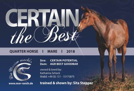 HESNAPPINALLDAYgeb: 2016 sorrel, geldingTHIS MINUTES CRUISINgeb: 2011 bay, mareSHES A VERTICAL LOPERgeb: 2013 red roan, mareGL ONLY TO BEATgeb: 2016 bay, mareCERTAIN THE BESTgeb: 2018 brown, mare